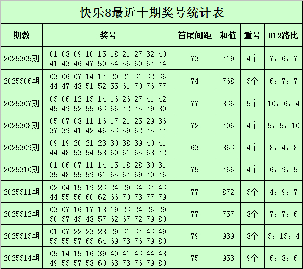 福彩无礼8第2025314期开奖回来:05 14 15 16 39 40 41 43 44 48 49 53 57 58 60 63 73 76 79 80,其中奖号首尾间距为75,和值为953,012路比为6:8:6,包含7组同尾号码:40-60-80、43-53-63-73、14-44、05-15、16-76、48-58、39-49-79,开出9个重号:43、49、53、57、63、73、76、79、80。