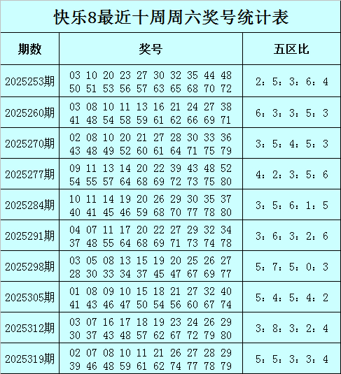 福彩自得8第2025319期(上周六)开奖追忆:02 07 08 10 11 21 26 27 28 29 39 46 48 59 61 62 74 77 78 79,其中奖号五区比为5:5:3:3:4。