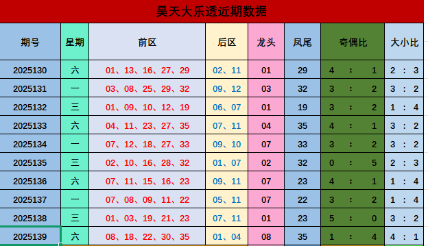 大乐透第2025139期奖号为:前区08,18,22,30,35。后区01,04,龙头:08,凤尾35,奇偶比为1:4,大小比4:1。