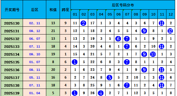 上期后区中奖号码为01 04,近10期后区玄虚奇偶比15:5,奇数出号占优,本期保举偶奇组合02,09。