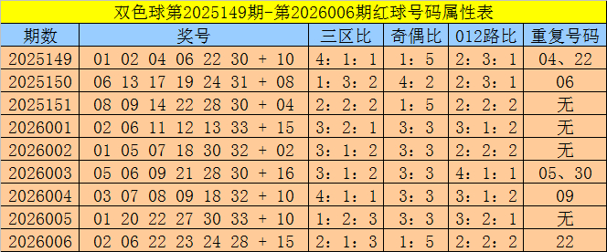 福彩双色球第2026006期奖号为:02 06 22 23 24 28 + 15,红球奇偶比为1:5,三区比为2:1:3,012路比为2:2:2,重号:22。