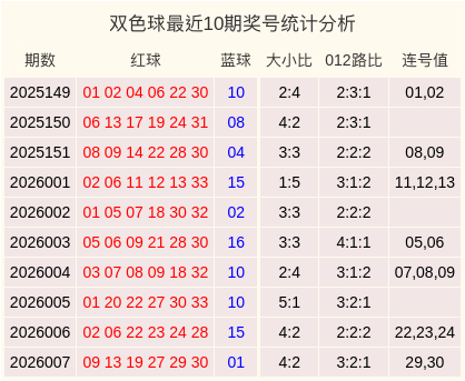 上期大小比为4:2,开出1组连号29,30,012路比为3:2:1。 最近10期双色球奖号统计表